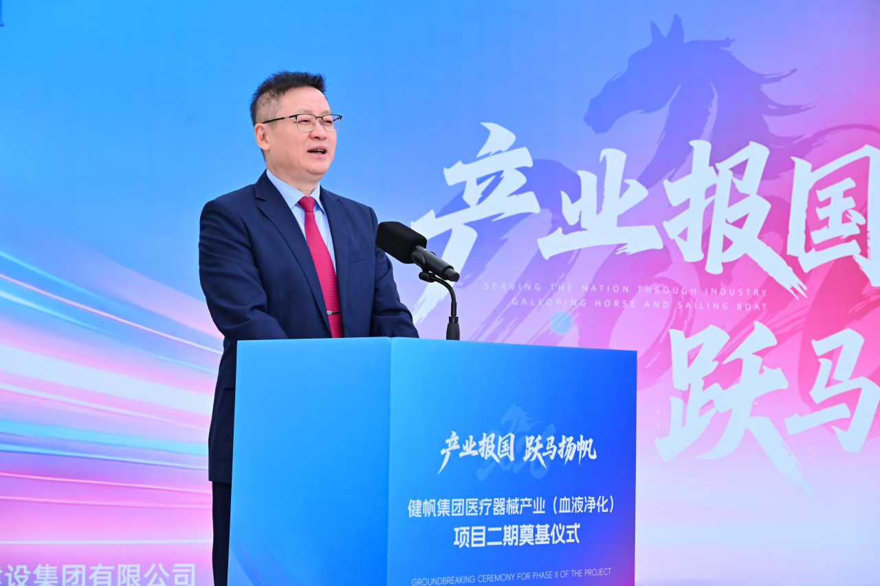 高新区党工委书记赵适剑在致辞中充分肯定了健帆集团坚持创新驱动、追求高质量发展所取得的成就。他指出,健帆作为中国血液净化领域的领军企业,始终坚持自主研发,在血液灌流、免疫吸附等高端医疗器械赛道深耕细作,斩获多项填补国内空白、引领行业发展的创新成果,是“中国原研原创”走向世界的典范。他表示,二期项目聚焦智能化制造升级与高端产能扩充,高新区将秉持“开工为王、投产为王”的理念,为项目建设提供全周期保障,全力支持企业做大做强。