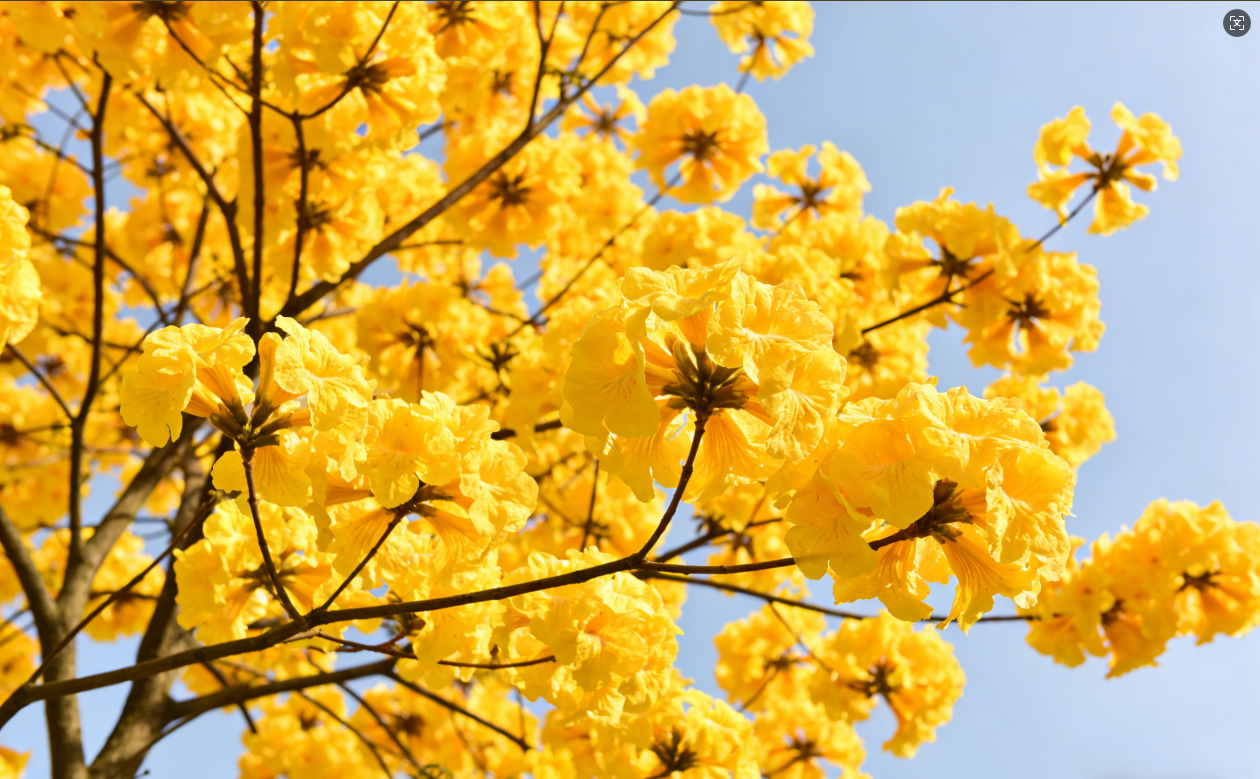 黄花风铃木,又名黄钟木,为紫葳科落叶乔木。它先花后叶,每年春季盛开,花朵呈漏斗状,满树金黄如串串风铃悬挂枝头,观赏价值极高。